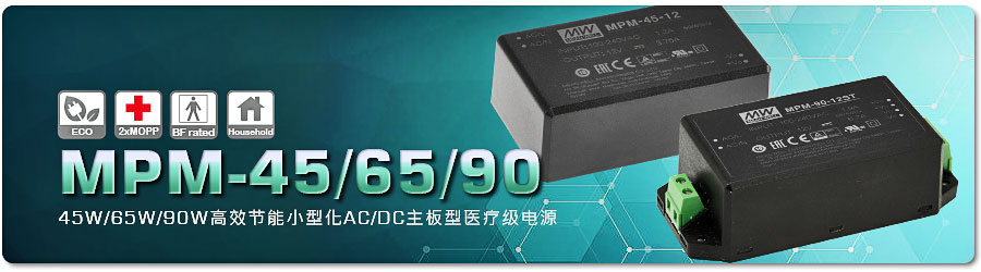 因应医疗仪器小型化趋势及更高功率需求,明纬继推出 MPM-05/10/15/20/30(5~30W)系列后,向上延伸新推出45~90W的MPM-45/65/90系列。此3系列为板上型(on board type)医疗级??榈缭矗视糜谥苯雍附釉诟骼嗟缱右瞧髦甈CB母板上,另有规划MPM-45/65/90-xST端子台式配线机种可供选用。