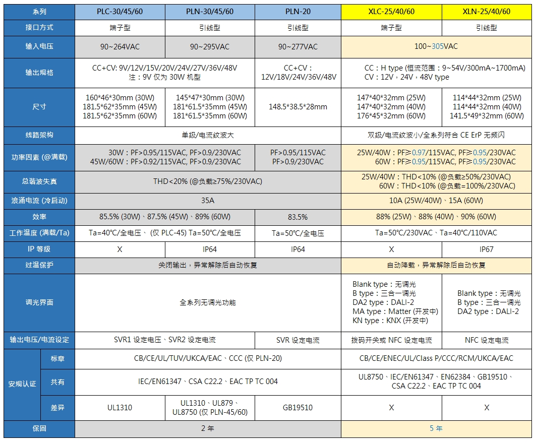 XLN/XLC 系列:25W/40W/60W 智能调光 LED 驱动电源