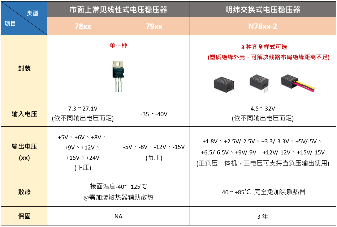 明纬继推出 1A 非隔离小尺寸高效交换式 DC-DC 稳压器 N78xx 系列后,新推出了更高电流 2A 机型:N78xx-2 系列,引脚与传统 TO-220 封装 78xx 与 79xx 线性低效电压稳压器完全兼容,可直接替换,使用 N78xx-2 最大好处是效率高达 96% 且不需额外加装散热器,可让系统设计者轻松解决低效热损问题非常适合内置于各类电子仪表、电源供应器、分布式电路系统…等。