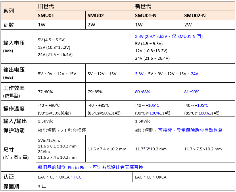 为让用户对于新旧品规格差异能快速了解与选型,详如下表请参考: