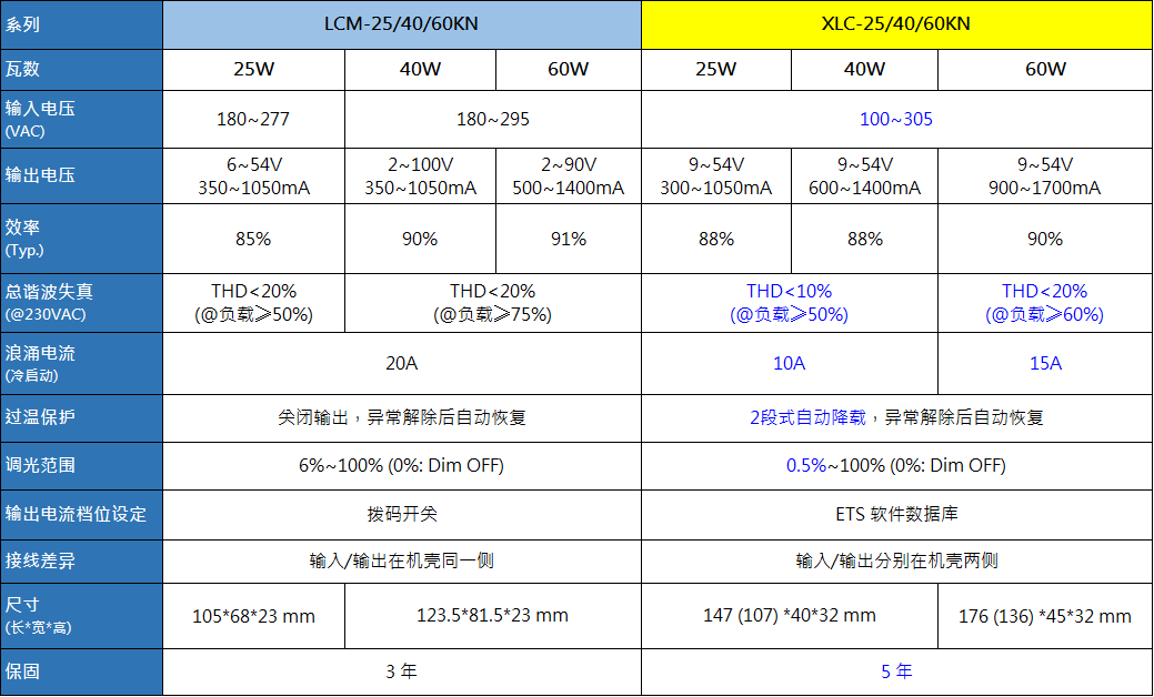 XLC-25/40/60KN 系列是分别对应 25W/40W/60W 功率的 AC/DC 恒流型 LED 驱动电源,内置具有数据加密功能的 KNX 接口,直接对接 KNX 系统实现数位照明控制。此系列机型可工作在输入电压 100~305VAC,并提供涵盖了 350mA~1700mA 范围的电流档位(注:三个不同瓦数的机型电流范围有差异)。得益于最高可达 90% 的转换效率,整系列可于自然风冷散热下工作于 -25°C~85(90)°C 之机壳温度范围。XLC-25/40/60KN 提供多种功能:如独立式按压调光/群控开关灯/场景,累计工作时间,能耗资讯回馈,恒定照度输出,定时调光,电源温度检测,特性曲线校正等,为智能建筑中 LED 照明系统提供最佳的解决方案。