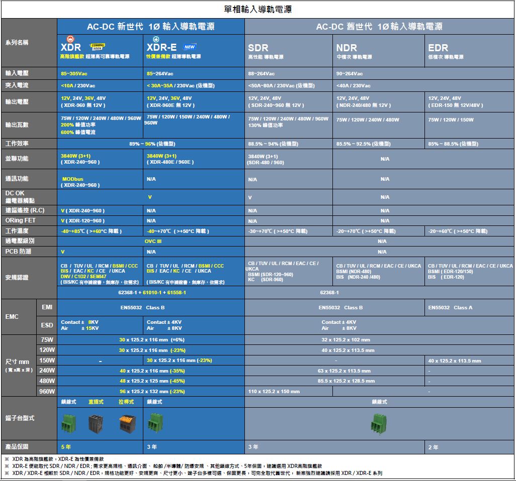 XDR-E 系列:75W~960W 全新世代 1? 输入超薄性价兼备导轨电源
