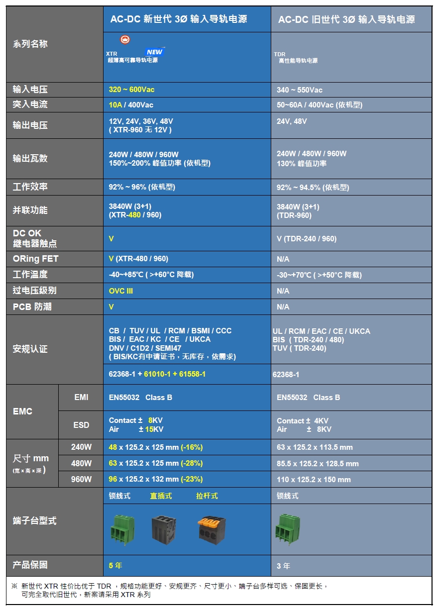 全新XTR系列在尺寸、效率、功能规格、保固期、安规认证及价格等方面,全面优于旧世代 TDR 系列,具备更高性价比,可完全取代TDR系列。主要升级差异包括: