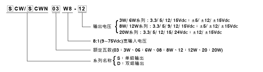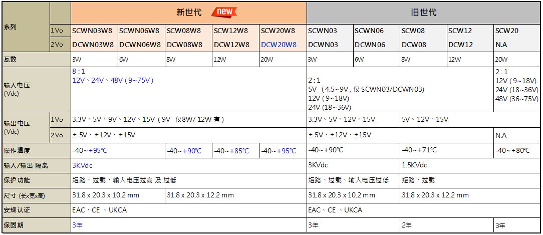 明纬DC-DC模块型单组输出SCWN03/ SCWN06 / SCW08 / SCW12 / SCW20及双组输出DCWN03 / DCWN06 / DCW08 / DCW12 DIP 双排标准引脚封装3~20W 2:1 输入机型上市多年,年销数十万台,广泛应用于电力、电子仪表、通信设备、工业自动化控制、IoT…等, 新上市次世代8:1输入超宽压输入单组输出 SCWN03W8/ SCWN06W8 / SCW08W8 / SCW12W8 / SCW20W8及双组输出 DCWN03W8 / DCWN06W8 / DCW08W8 / DCW12W8/ DCW20W8共5系列。