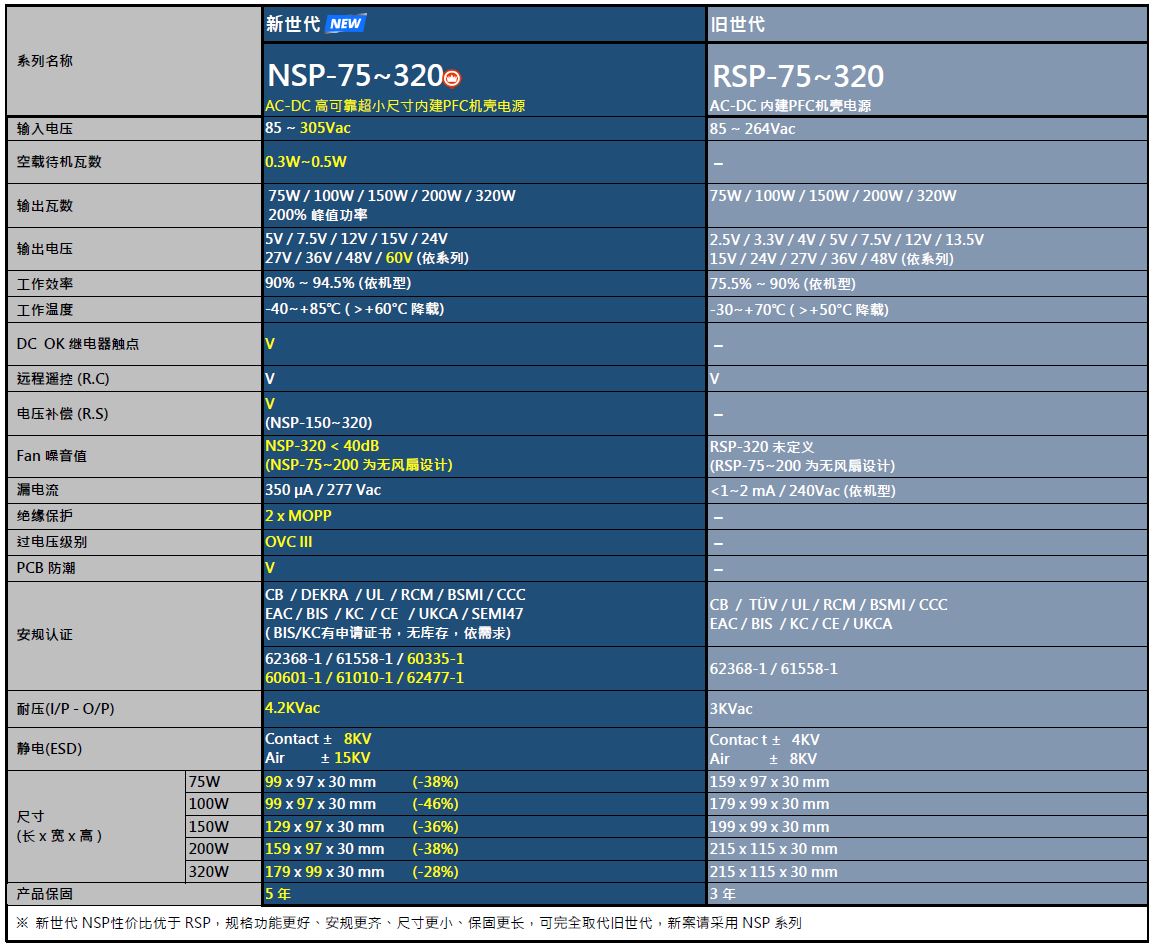 全新 NSP 系列以更高性价比全面超越 RSP 系列,体积大幅缩小,工作温度范围扩大至 -40~+85℃,在 +60℃ 仍可满载运行,适用更严苛环境;同时通过资通讯、工业、医疗、家电与新能源等多领域安规认证,耐用可靠。NSP 系列可取代旧世代,搭配实惠价格,保固年限延长,强化系统降本增效,是为新案设计首选。