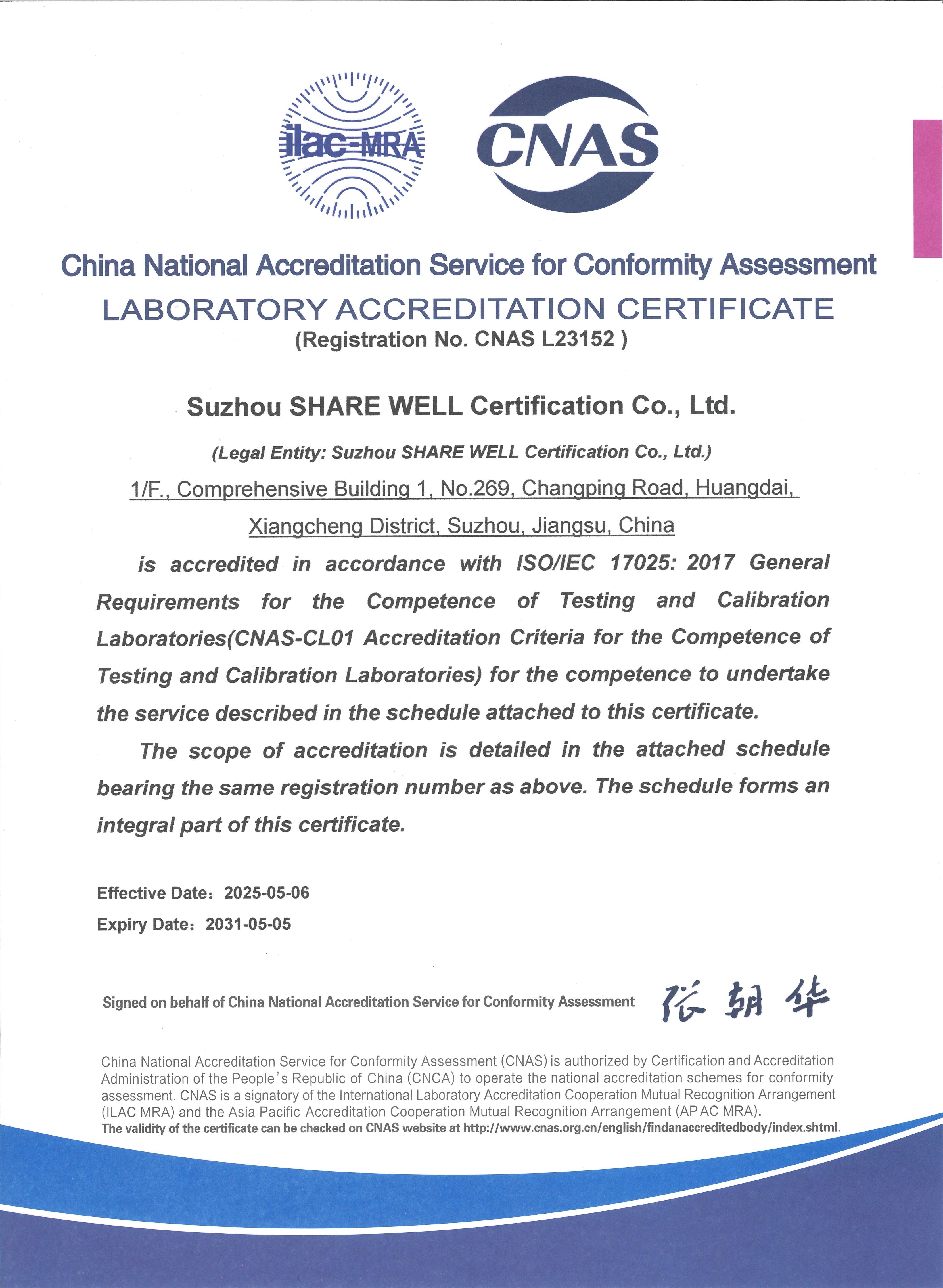 2025年5月6日苏州协纬认证有限公司正式获得中国合格评定国家认可委员会(CNAS)颁发的实验室认可证书(注册号:CNAS L23152)。这标志着该实验室在电磁兼容检测领域的技术能力和质量管理体系已达到国际水平。
