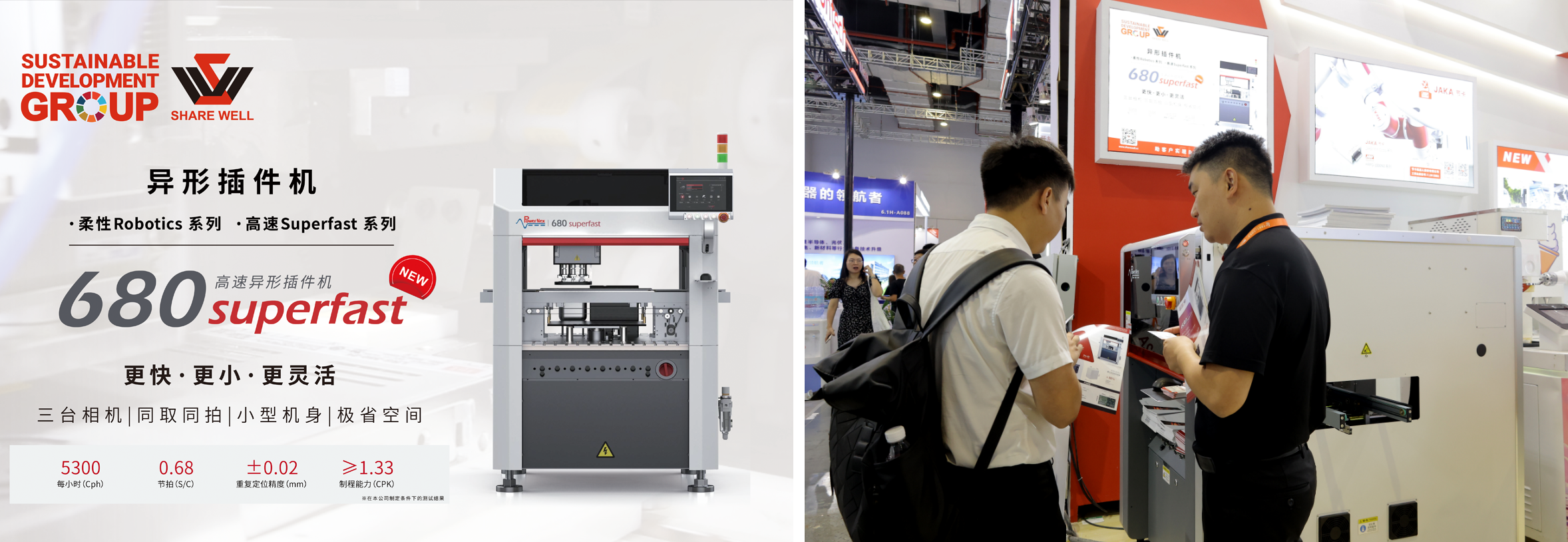 680 Superfast系列高速异形插件机采用龙门式结构,以机器视觉、运动控制和深度学习算法为核心,其精度、速度、灵活性和兼容性已达到行业领先水平。其具有更快、更小、更灵活以及三台相机,同取同拍,小型机身,极省空间等特点获得较多客户的认可。