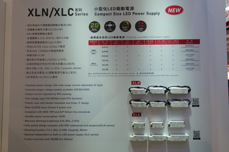XLN/XLC 系列的一大亮点是支援以NFC近场通讯技术来设定电流档位的功能,提升了产品灵活性和便利性;此外还支援多种调光控制介面,包括三合一、DALI–2 及 KNX 等有线调光介面,以及 Matter 无线调控介面,便于整合智能控制方案;再者支援100-305V AC全电压输入,采隔离方案设计,并具备完善的安规认证。