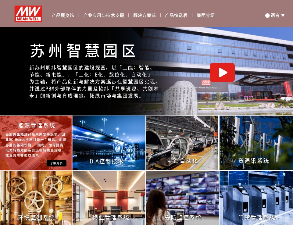 甫于2022/11/10全新开幕启用的苏州明纬智能园区,以明纬集团推广「三能:智能、节能、新电能」、「三化:E化、数字化、自动化」为主轴,实现产品创新与解决方案的应用园区。诚挚的邀请您参观园区内的八大系统科技应用,您将了解标准电源于各产业应用息息相关的明纬,所提供各式丰富的解决方案。