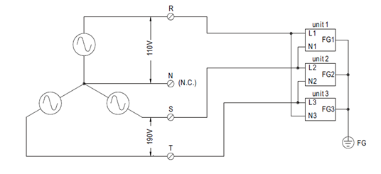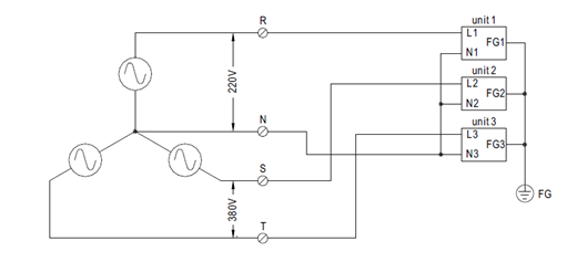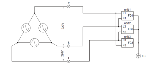 若三相平衡问题不是主要议题或客户可以搭配其他系统负载让三相电源达到平衡,客户也可以任取两相线电压直接接到单相交流电源输入的产品,如图六~图八中VR-S / VS-T / VT-S对单一台Unit的L / N配线;但需确认其交流电压值须介于产品的输入电压范围。在实务上,终端客户若搞不清楚其电力系统到底是属于哪一种?则可以直接拿数字三用电表量测任两条线的电压值,只要介于产品的输入电压范围即可。