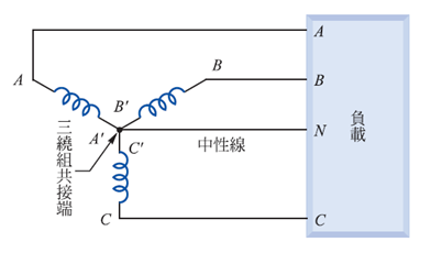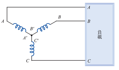 三相系统绕组的接法,有星形(Y)跟三角形(?)两种。星型接法是将三绕组的一端接在共同点N,另一端则分接在负载端,如图三所示。共同点N称为中性点,若由中性点接出引线,并接在负载端,则接在负载端有四条接线,称此接法为三相四线式系统(3Φ4W)。如图四所示,若中性点没有引线接出,则称为三相三线式系统(3Φ3W)。一般是将中性点接地,以大地代替中性线,好处是可加装保护设备,以增加安全性。星形接法相与线的电压、电流关系为: