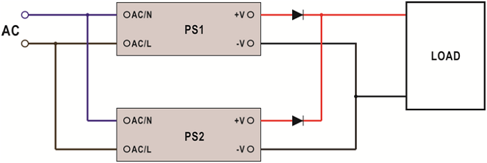 传统冗余电源接法是由2个或多个电源于正端分别串接二极管的方式并联输出至电源总线上,如图二所示。可以让1个电源单独工作,也可以让多个电源同时工作。当其中1个电源出现故障时,由于二极管的单向导通特性,不会影响电源总线的输出。