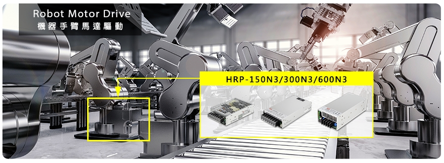 工业机器手臂是一种仿真人臂功能的机械电子装置,可替代人力完成许多繁复的作业要求。随着工业自动化的进程加速,其应用也日益广泛。机器手臂中用到直流马达作为其运动位移的驱动,来完成诸多动作。而明纬的HRP-N系列电源可提供持续5秒的250%峰值功率供直流马达完成高可靠度的瞬时启动,消费者无需再花费过高的价格购买大功率电源。