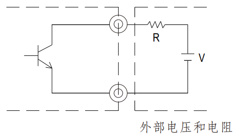 以下为一简易外部线路外加一直流电压源 V 与限流电阻 R: (最大供电电压为 50VDC,最大吃载电流为 30mA)