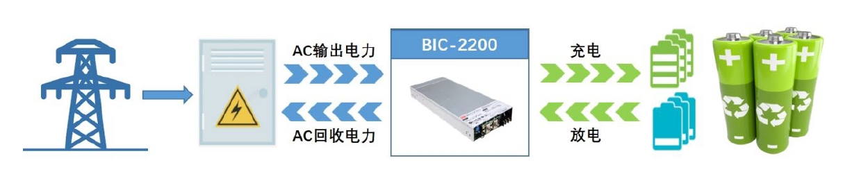 随着“净零碳排”目标的推进,新能源汽车、光伏等产业不断发展,带动锂电池产业规模持续扩大。在锂电池产业发展中,无论是在生产端的充放电测试,还是到家用储能系统的备用能源,双向电源都扮演了不可或缺的角色。明纬双向电源 BIC-2200 系列适用于各类电池生产工厂。在电池化成与分容阶段(如图1.),使用 BIC-2200 对电池充电,同时也可将电池释放的能量回馈至电网供其他 AC 设备使用,降低企业用电成本。