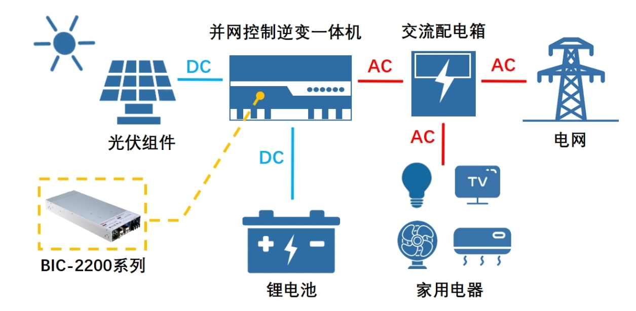 家用储能系统(如图2..),主要包括光伏组件、锂电池、并网控制逆变一体机和家用电器等。在夜间把电力系统的低价电力,通过一体机内部的BIC-2200对锂电池充电储能;在白天电网高负荷的时候,锂电池再经BIC-2200反向输出能量并回馈至电力系统,不仅可以削峰填谷,减轻电网波动,还能为家庭节省电力开支。
