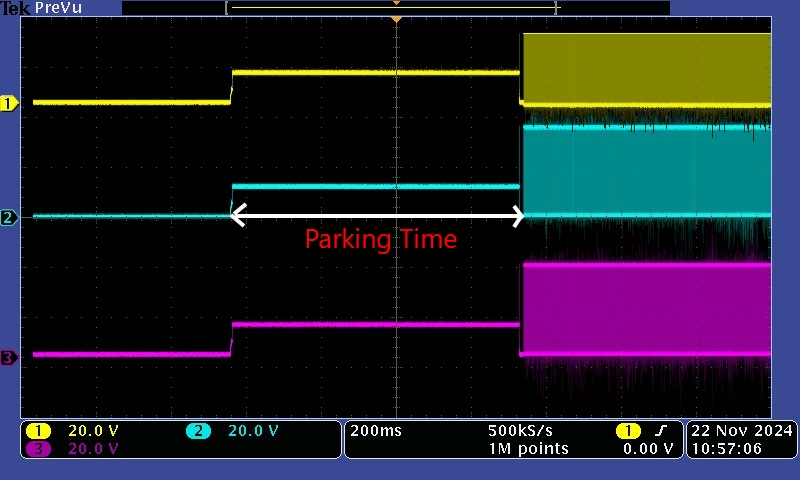 如图 2 所示,在马达启动过程中,存在一个停放阶段(parking phase),此时U、V和W三相信道输出电压以校准转子的位置。在完成这一检测后,马达会正式启动,转子开始旋转。