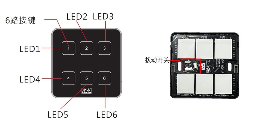 - 人性化互动:内置拨动开关,按键背光亮度可调(高亮、微亮、关闭),蜂鸣器声音可开启或关闭,兼顾黑暗环境操作便利性与静音需求;支援快速切换背光功能与回馈功能(符合DALI IEC 62386-332标准)