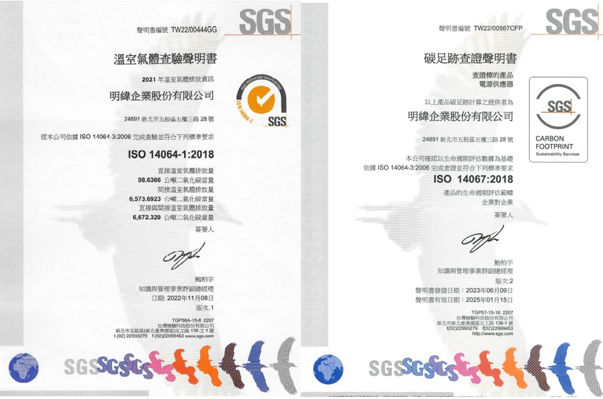 SDG集团为实现企业永续发展,并积极推广SDG理念,于2022年3月明纬集团总部启动了温室气体盘查计划(ISO 14064-1),总部获得第三方SGS查证合格(Link)。于2022年9月展开了产品碳足迹计算(ISO 14067),选定RSP-1000-48产品执行查验认证,亦经第三方SGS查证合格(Link)。SDG集团推动各分公司依序完成温室气体盘查及产品碳足迹计算,强化对SDG理念的实质支持。