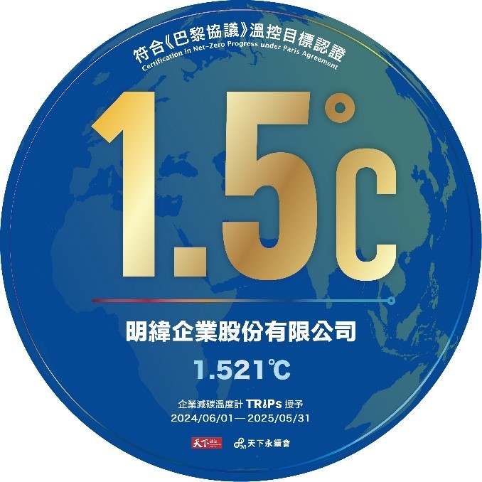 「企业减碳温度计」(Temperature Rising Index for Pathways, TRIPs)由天下杂志与东海大学企业永续影响力中心共同发布,采用联合国政府间气候变化专门委员会(IPCC)发布之地球升温情境,将全球升温潜势模型(Absolute Global Temperature Potential, AGTP)应用在企业的温度评分。以企业自定义的减碳与净零目标,仿真升温数据,即为企业未来减排路径的温度。明纬经此模型推算温度评级为1.521°C,符合于巴黎协议升温1.5°C控制目标,更远低于台湾制造业2.79°C的平均温度评级。